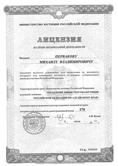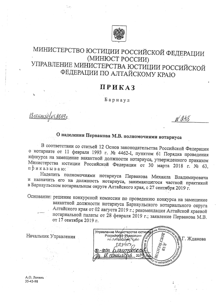 Приказ Управления Министерства юстиции Алтайского края "О наделении Первакова М.В. полномочиями нотариуса" № 248 от 18 сентября 2019 года